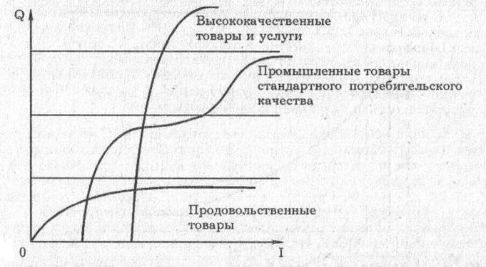 Уже в XIX в. было замечено, что с ростом реального дохода потребителя потребление вторичных благ возрастает быстрее, чем благ первой необходимости. Первым исследователем, занимавшимся вопросами влияния изменения дохода на структуру потребительских расходов, был немецкий статистик Эрнст Энгель (1821 — 1896). Кривые Энгеля в современной интерпретации (прилож.Ж). Отложим на оси абсцисс доход потребителя I, а на оси ординат — количество оплачиваемых им продуктов Q. Прежде всего, происходит насыщение продовольственными товарами, затем — промышленными товарами стандартного качества и лишь позднее — высококачественными товарами и услугами. Отмечена закономерная любопытность: даже после перехода к потреблению высококачественных товаров и услуг происходит новый всплеск спроса на промышленные товары стандартного качества, которые используются потребителем для повседневных нужд.