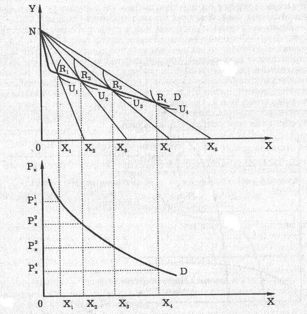 Рассматривая кривую «доход-потребление», мы исходили из постоянства цен благ. Изменялся только доход. Теперь предположим в качестве постоянной величины доход, а в качестве переменной возьмем цену одного из благ, например блага Х. Допустим, что цена блага Х снижается, то есть Р1х >P2x >P3x и т.д. Например, 1 единица блага Х стоила 100 долларов, а теперь стоит 50 долларов. Это значит, что за 100 долларов покупатель может купить 2 единицы блага Х. Графически это выглядит как сдвиг бюджетного ограничения из положения NX2 в положение NX3 (прилож.З). Дальнейшее снижение цены соответственно отражают прямые NX4, NX5 и т.д. Обозначив точки касания кривых безразличия 1, U2, U3, U4 с бюджетными ограничениями точками R1, R2, R3, R4 и соединив их, мы получим кривую «цена-потребление».