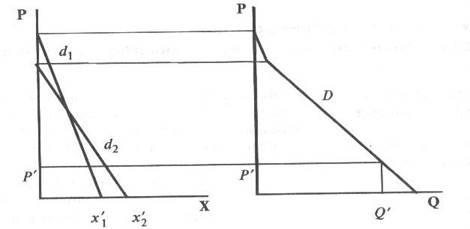 Рыночная кривая спроса D получается в результате сложения по горизонтали индивидуальных кривых спроса.(прилож.И).