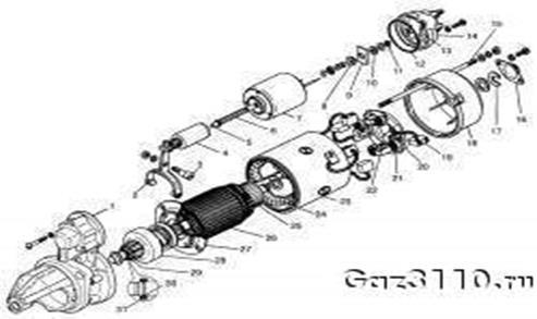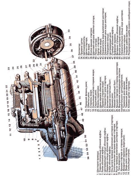 Стартер разбирают через каждые 100 000км пробега автомобиля и при ремонте в случае необходимости. При разборке необходимо отогнуть запорную шайбу и, установив специальный ключ на шестерню, отвернуть гайку, снять шайбу и шестерню. Отвернуть винты крепления крышки стартера и снять ее, легко ударяя по ней алюминиевым молотком. Снять опорный фланец муфты, для чего отогнуть усы стопорных пластин и вывернуть болты крепления. Вынуть ведомый вал муфты с набором дисков. Из внутренней полой части вала с помощью крючка вынуть резиновую уплотнительную втулку. Для снятия штока необходимо сначала снять защитный кожух (крышки со стороны коллектора) и тяговое реле, так как шток вынимается со стороны коллектора.