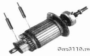 Контрольной лампой (см. рис.6 ) или прибором Э236 проверить на отсутствие замыкания обмотки якоря на магнитопровод якоря (рис. 8). Для этого следует подсоединить один конец к любой из ламелей коллектора, а другой к магнитопроводу якоря. Лампа гореть не должна. Внимательно осмотреть якорь. Лобовая часть обмотки якоря должна быть по диаметру меньше пакета железа. Увеличенный диаметр лобовой части обмотки указывает на ее «разнос». Такой якорь подлежит замене. Концы проводов обмоток должны быть надежно припаяны к коллектору. Якорь следует проверить на приборе Э236 на отсутствие витковых замыканий. В случае обнаружения замыкания якорь заменить.