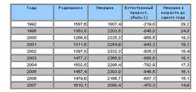 Ожидаемая продолжительность жизни в 1992 г. составляла 67,8 года, 1995 - 64,5, 2001 - 65,2, а с 2003 года начинает расти и составляет 65,3 года, а в 2007 – 67,5 лет. Причем, разница между ожидаемой продолжительностью жизни мужчин и женщин составляла в 2007 г. 12,5 лет в пользу женщин. Согласно Федеральной службе государственной статистике в России в 2007 г. умерло в 1,3 раза больше, чем родилось. Сверхсмертность мужчин, особенно в трудоспособном возрасте, привела к тому, что в России средняя продолжительность жизни мужчин упала до 59 лет. Это один из самых низких в мире показателей. Специалисты считают, что причинами низкой рождаемости и сверхсмертности являются катастрофическое падение уровня жизни, ухудшение качества питания, рост заболеваний, недоступность многих медицинских услуг для значительной части населения, стрессы, ухудшение нравственно-психологической атмосферы в обществе, неопределенность и непредсказуемость социальных процессов.