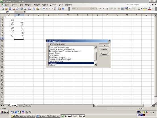 Табличный процессор Excel так же позволяет проводит автоматизированный корреляционно- регрессионный анализ. Для этого в опции Сервис находим пакет анализа данных (см. рис.)