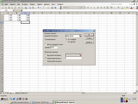 Автоматизированный дисперсионный анализ возможен с помощью табличного процессора Excel.Для этого в опции Сервис находим пакет анализа данных (см. рис.)