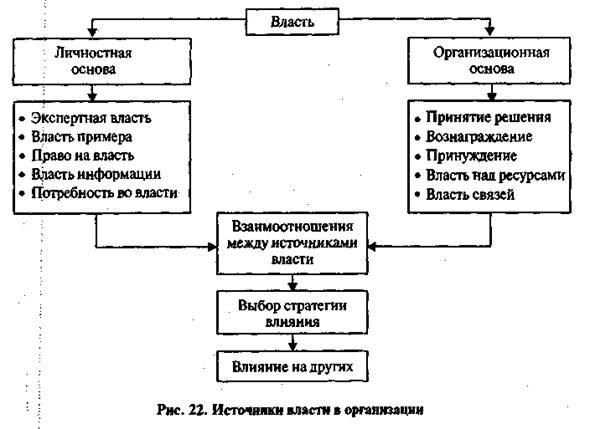Специалисты разработали несколько подходов к классификации источников власти. Согласно одному из них выделяют пять базовых источников: принуждение, экспертная власть, закон или право принятия решений, пример или харизма, вознаграждение. Позже был добавлен шестой источник — информация, а потом и седьмой —связь. В нашей классификации — десять источников власти. При этом все источники разделены на две большие группы. К первой группе отнесены имеющие личностную основу, ко второй —организационную, которую называют также структурно-ситуационной (рис. 22).