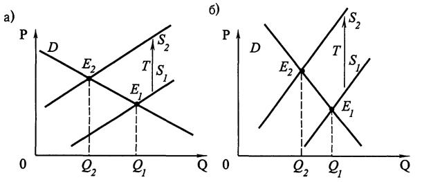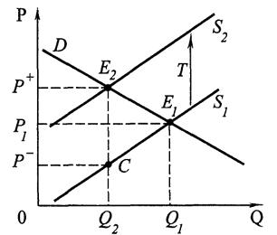 то теперь они согласятся предложить на рынке то же количество товара, если только цена-бруто (с включением налога) будет на Т руб. выше, чем Р1