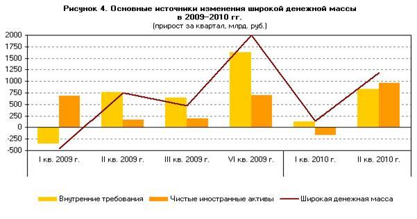 За первое полугодие 2010г. рост широкой денежной массы составил 1321,2 млрд. руб., при этом чистые иностранные активы банковской системы увеличились на 811,4 млрд. руб., а внутренние требования — на 960,3 млрд. руб. (За первое полугодие 2009г. широкая денежная масса возросла на 280,8 млрд. руб. при увеличении чистых иностранных активов на 851,7 млрд. руб., внутренних требований на 431,3 млрд. руб.) Рост внутренних требований в большей степени был обусловлен ростом требований к организациям и населению, тогда как чистый кредит органам государственного управления остался практически без изменений.