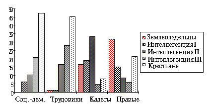 Две колонки цифр дают нам предварительную информацию о том, что такое "типичный трудовик" и "типичный кадет". Следует отметить, что две группы свойств не так тривиальны, как это кажется на первый взгляд. Дело в том, что рассматриваемая база данных воспроизводит неоднозначную терминологию своих источников. Например, слово "крестьянин" в действительности может обозначать различные свойства в зависимости от того, используется ли оно для указания сословия, происхождения или занятия. Корреляция между последними тремя свойствами может быть невысокой. Реальный крестьянин определяется лишь целым набором свойств, и это как раз тот набор, который мы встречаем в кластере свойства "трудовик".