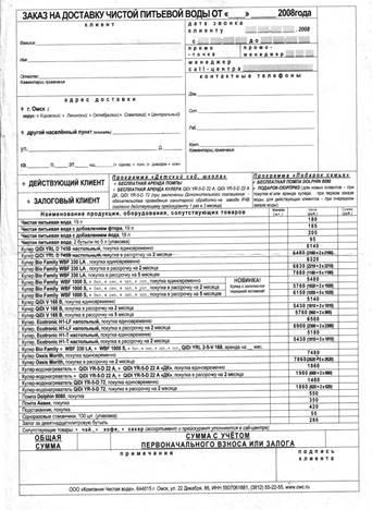 · в одном заказе может быть указан только один вид продукции(воды) и один вид оборудования; если необходимо заказать два разных вида оборудования или несколько различных видов продукции нужно будит заключить новый договор;