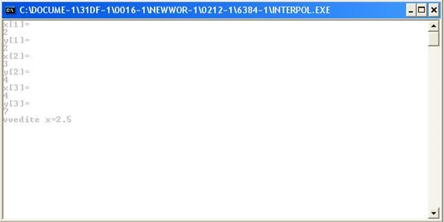 В данной работе была изучена и проанализирована справочная литература, вследствие чего были выявлены два наиболее простых и удобных вида интерполяции – линейная и квадратичная; созданы программы в системе программирования Borland Turbo Pascal 7.0 для вычисления значений функции f(