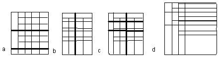 Рис. 3. Примеры таблиц иерархической структуры: a) Таблица с горизонтальной иерархией; b) Таблица с вертикальной иерархией; c) Таблица с горизонтальной и вертикальной иерархией; d) Таблица с двумя уровнями горизонтальной иерархии.