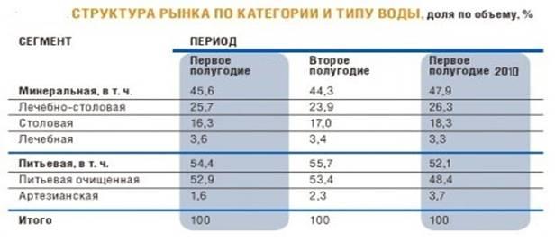 На рынке 10 крупнейших городов (Владивостоке, Екатеринбурге, Краснодаре, Москве, Нижнем Новгороде, Новосибирске, Ростове-на-Дону, Самаре, Санкт-Петербурге, Уфе) более половины продаж рассматриваемой категории приходится на питьевую воду - очищенную и артезианскую.