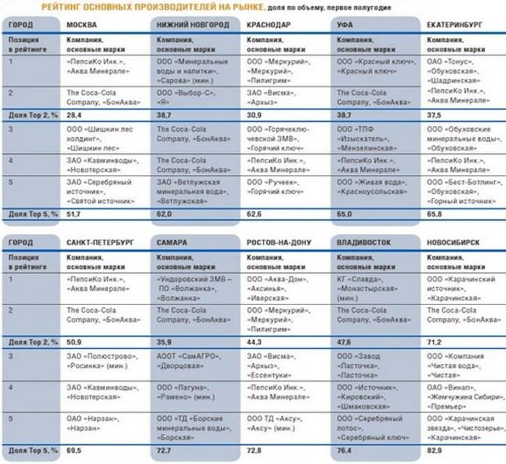 В целом на рынке 10 исследуемых городов лидируют компании «ПепсиКо», The Соса-Соla Company, «Шишкин лес», «Кавминводы» и «Висма», на которые приходится примерно половина совокупного рынка. Тем не менее список лидирующих компаний сильно отличается от города к городу