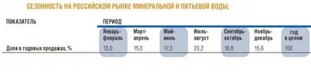 Для рынка минеральной и питьевой воды характерна сезонность. Это один из наиболее существенных факторов и спрос должен увеличиваться с наступлением жары, так как это означает увеличение потребления воды. Пик продаж наступает летом. В России в 2009 году пятая часть продукции была реализована в июле-августе, тогда как на зимние месяцы - январь-февраль - пришлось всего около 13% продаж . Несколько сильнее сезонность выражена в сегменте питьевой воды, хотя в некоторых городах, например в Екатеринбурге, Новосибирске, Краснодаре, это явление более заметно в сегменте воды минеральной.