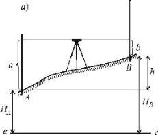 В строительстве отсчет высоты ведут от условной нулевой отметки — уровня пола первого этажа. Нулевая отметка по проекту должна иметь абсолютную отметку (т. е. от уровня моря). Допустим, что уровень нулевой отметки нужно закрепить на обноске (рис. 115, а). Абсолютная от метка нулевой точки по проекту равна 102,285, а отметка репера — 104,012. Следовательно, уровень нулевой отметки ниже уровня репера на 1,727 м. Чтобы перенести нулевую отметку на столб 4 обноски, между ним и репером устанавливают нивелир 3, на репер ставят рейку 2 и делают отсчет. Предположим, что отсчет по рейке равен 525 мм. Тогда отметка горизонта инструмента будет 104,012+0,525 = 104,537 м. За тем вычисляют разность между отметкой горизонта инструмента и абсолютной отметкой нулевой точки: 104,537—102,285 = 2,252 м. Эту разность должен дать отсчет по рейке, установленной на нулевой отметке. Визируя на рейку, ее устанавливают у столба обноски таким образом, чтобы отсчет по рейке был 2252 мм. Получив этот отсчет, по нижнему концу рейки на столбе обноски прочерчивают линию, которая служит уровнем нулевой отметки. Для закрепления этого уровня на столбе обноски забивают штырь или гвоздь.