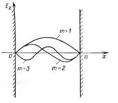 Из выражений (1.16) следует, что распределение поля вдоль оси х имеет форму стоячей волны. Характер изменения поля на интервале определяется числом (индексом) . Согласно (1.16) при различных на промежутке между плоскостями будет укладываться различное число «полуволн» поля, причем это число как раз и равно . На рис. 1.2 изображены кривые изменения вдоль оси х, соответствующие разным . (Максимальные значения для различных «гармоник» здесь выбраны произвольно. Начальные фазы взяты или одинаковыми или отличающимися одна от другой на )
