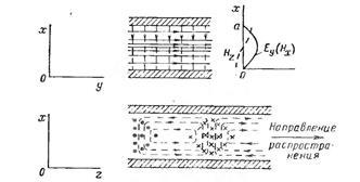 Рис. 5 - Силовые линии векторов и волны в пространстве между проводящими плоскостями