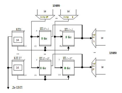 В кінці канального інтервалу під дією сигнала 1, який створюється формувачем імпульсів ФІ1, кодові комбінації з РЗвх одночасно по 8 проводах переписуються в РПвх.