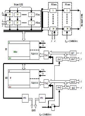 Вхідні тракти із швидкістю потоку 2,048 Мбіт/с поступають на вхідні регістри зсуву РЗвх. Після чого відбувається перетворення вхідних канальних повідомлень з послідовного коду у паралельний. Відбувається це у регістрах РПвх.