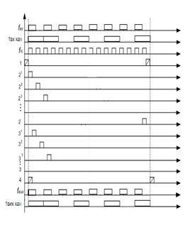 Коли кодові комбінації запишуться у всі регістри РПвих, вони швидко перезаписуються у вихідні регістри зсуву РЗвих під дією імпульсу 4, який виробляється ФІ2. Після перезапису кодових слів з РПвих в РЗвих, вони починають зчитуватися послідовно у вихідні ЗЛЦ під дією імпульсів тактової частоти fвих.