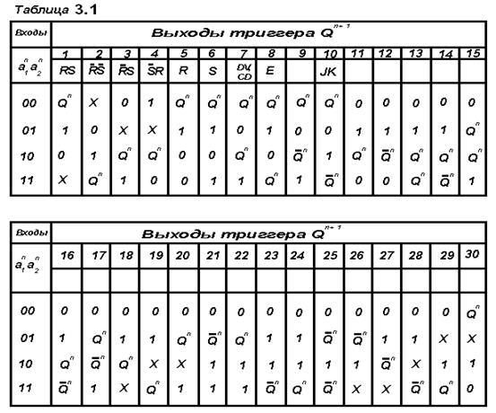Х – неопределенное состояние триггера, характеризующееся тем, что в процессе действия информационного сигнала на входе триггера, выходные логические уровни плеч триггера и одинаковы ( или ), а после окончания действия информационного сигнала триггер может перейти в состояние или с равной вероятностью, то число теоретически возможных типов триггеров с n информационными входами равно , где 5 – количество возможных состояний на выходе триггера, - количество наборов содержащих все n входные переменные. Следовательно, при числе входов 2 (n=2) формально существует 625 типов триггеров (автоматов). Однако большинство из них либо не обладает полной системой переходов, либо тривиальны, либо просто бессмысленны. Примерами таких автоматов можно назвать автоматы, которые на всех наборах переменных принимают постоянные значения 0, 1, , или неопределенное значение, или их комбинацию, например 0, Х, Q, X и т.д. Поэтому их 625 можно назвать сравнительно небольшое число триггеров (автоматов), которые могут обладать полной функцией переходов и иметь практический интерес. Технически реализуемых триггеров с одним информационным входом только 2, с двумя информационными входами – 24. Наиболее распространены двухвходовые триггеры, но синтезировано только восемь их типов, среди которых три – универсальные. Законы функционирования большинства из них приведены в таблице 1.