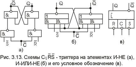 RS - триггера на элементах И-НЕ (а), И-ИЛИ-НЕ(б) и его условное обозначение (в) |