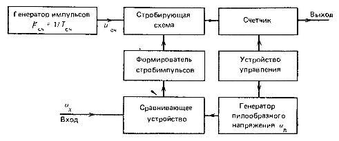 УС – устройство сравнения; ФИ – формирователь импульсов; ВС – временной селектор; СИ – счётчик импульсов; ЦОУ – цифровое отсчётное устройство; ГПН – генератор пилообразного напряжения.