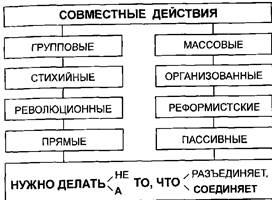 Совместные социальные действия подразделяют на стихийные и организованные, революционные и реформистские. Реформа