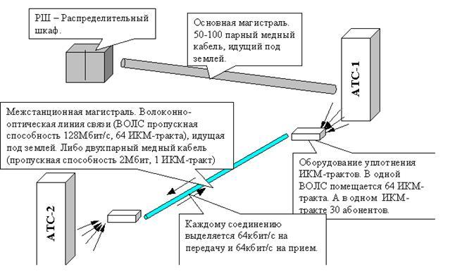 Как видно из рисунка многопарный медный кабель из-за дороговизны обслуживания и низкого качества соединения теперь используется эффективнее. Но на смену пришла ВОЛС (Волоконно-оптический линия связи), которая передает цифровой поток со скоростью до 300Мбит/с и более(скорость передачи цифрового потока по 4-парному медному проводу 2Мбит/с). То есть теперь абонентское соединение после коммутации на механической АТС аналоговый сигнал выходит со станции и входит в оборудование ЦСП. Аналого-цифровой преобразователь (АЦП) превращает этот сигнал в цифровой поток 64кбит/с на передачу и 64кбит/с поток в аналоговый сигнал на прием. Потом 30+2 цифровых потока (2 управляющих) по 64кбит/с объединяются в один 2Мбит-ный поток E1 (ИКМ-тракт). В ВОЛС входит до 64 потоков E1. С другой стороны магистрали ситуация повторяется с точностью до наоборот. С ВОЛС снимаются 64 цифровых потока E1, далее каждый разбирается на 64кбит-ные потоки, и подаются на цифро-аналоговый преобразователь (ЦАП). Получившийся аналоговый сигнал поступает на станцию, и после коммутации к абоненту.