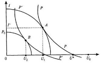 , так что максимально достижимый уровень предпочтительности для правительства комбинации инфляция – безработица будет I, и он будет касательным к существующей кривой Филлипса (РР) в точке А. Тогда разница в безработице (U0