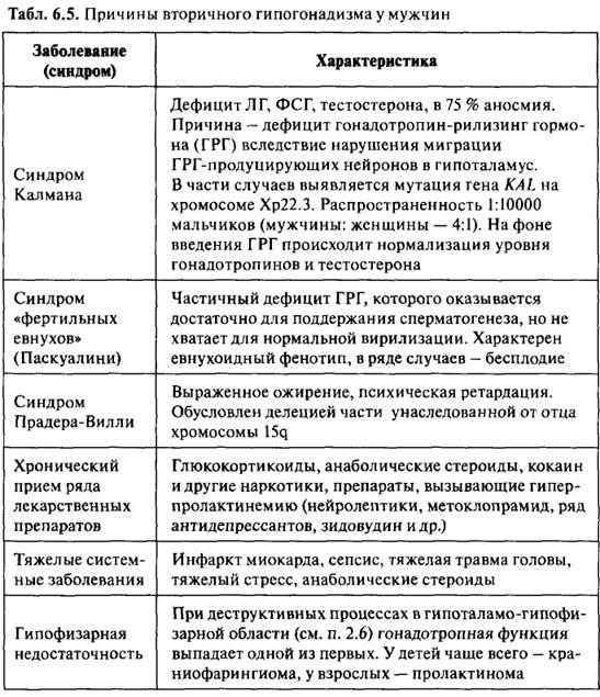 Гипогонадизм у мужчин - патологическое состояние, обусловленное уменьшением уровня андрогенов или снижением чувствительности к ним, которое может приводить к недоразвитию вторичных половых признаков или бесплодию. Выделяют первичный гипогонадизм, вызванный нарушением функции самих половых желез, и вторичный, возникший в результате снижения секреции гонадотропинов. Первичный гипогонадизм сопровождается гиперсекрецией гонадотропных гормонов и называется гипергонадотропным гопогонадизмом. При вторичном имеет место снижение секреции гонадотропинов - гипогонадотропный гипогонадизм. Реже встречается нормогонадотропный гипогонадизм, который характеризуется низкой продукцией тестостерона при нормальном уровне гонадотропинов. Кроме того, гипогонадизм может быть приобретенным и врожденным.