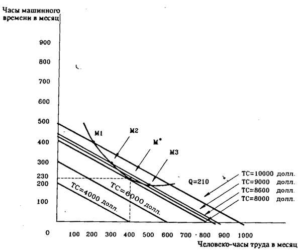 на изокванте. Этой точке соответствует применение 200 часов труда и 400 часов работы машин. Затраты на производство при использовании этого метода составят 10000 долларов в месяц.