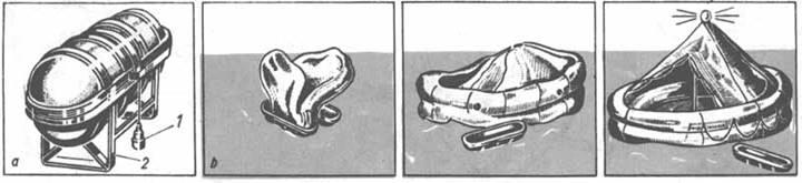 Другим групповым средством спасения является плот. Плоты снабжены запасами пресной воды и продовольствия, медикаментами и средствами сигнализации. Плоты наряду со спасательными шлюпками служат в качестве дополнительного спасательного средства (исключением являются боевые корабли). Существуют жесткие и надувные спасательные плоты. Жесткие спасательные плоты снабжены воздушными ящиками. На плавучее основание натянут, как правило, навес из водоотталкивающей ткани для размещения пострадавших. Жесткие плоты выбрасываются за борт. Потерпевшие из воды забираются на плот. Надувные плоты хранятся на судне в специальной упаковке (рис. а). После выбрасывания в воду плоты надуваются автоматически (рис. b). В данном случае потерпевшие также должны забираться на плот из воды. Иногда на пассажирских судах представляется возможность надуть плот на палубе, посадить туда людей и только после этого спустить на воду