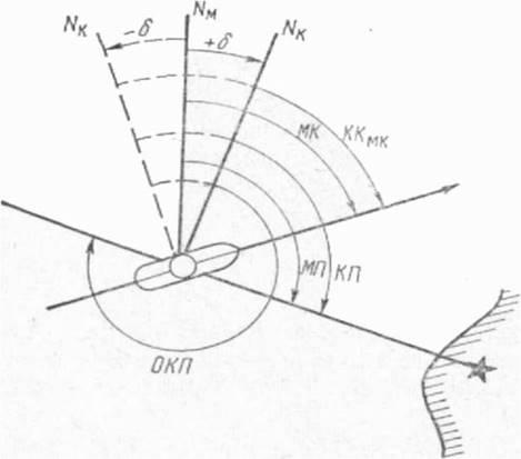 Магнитный компас работает, используя свойство намагниченной стрелки располагаться своей осью вдоль магнитных силовых линии магнитного поля Земли; следовательно, стрелка компаса должна показывать направление магнитного меридиана в данной точке на поверхности Земли. В связи с тем что на магнитную стрелку компаса, установленного на судне, действуют магнитные поля Земли и судового железа, ось магнитной стрелки или линия NS картушки магнитного компаса располагается в плоскости компасного меридиана.