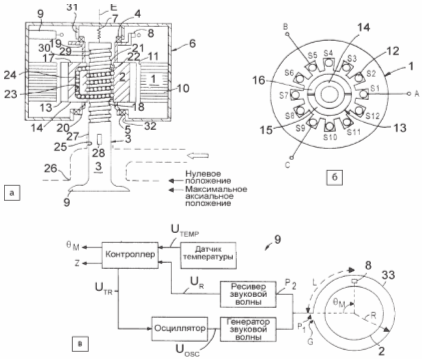 Рис. 26. Магнитостриктивный датчик положения клапана и/или ротора клапана двигателя внутреннего сгорания Ford Global Technologies: 1 — статор клапанной сборки; 2 — ротор; 3 — клапан; 4, 5 — подшипники; 6 — защитное ограждение; 7 — центрирующая пружина; 8 — вращающийся постоянный магнит для индикации углового положения ротора; 9 — магнитостриктивный датчик аксиального положения клапана 2 и/или углового положения ротора 1 электромеханической клапанной сборки; 10 — стек многослойного листового металла статора; 11 — центральное отверстие статора; 12 — обмотки статора; 13 — кольцевой магнит ротора; 14 — шаровая гайка; 15, 16 — сегменты магнита; 17 — цилиндрическая часть тела шаровой гайки; 18 — центральное отверстие шаровой гайки; 19, 20 — плечи для опоры; 21 — спиральная канавка цилиндрического тела; 22 — плоские участки — разделители спиральной канавки; 23 — возвратный канал для кольцевой прокатки примыкающих шаровых подшипников 24; 25 — апертура в головной части двигателя для установки клапанного штока; 26 — седло клапана; 27 — клапанный шток; 28 — антискручивающий волновод; 29 — спиральная канавка клапанного штока; 30 — плоские участки — разделители спиральной канавки клапанного штока; 31 — верхнее опорное плечо; 32 — отверстие для клапанного штока; E — ось вращения ротора (по часовой стрелке или против часовой стрелки); 33 — звуковой канал радиусом R; G — зазор в звуковом канале; θM