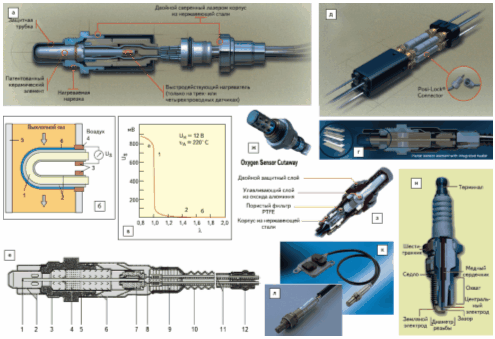 Thimble Type Oxygen Sensor Bosch; а — конструкция датчика; б — конструкция и принцип работы сенсорной ячейки: 1 — сенсорная керамика; 2 — электроды; 3 — контакт; 4 — контакт разъема; 5 — выхлопная труба; 6 — защитное пористое керамическое покрытие; в — передаточная характеристика: а — богатая смесь, б — бедная смесь; Us — сенсорное напряжение; г — планарный нагреваемый датчик концентрации кислорода Bosch; д, е — универсальный нагреваемый датчик Bosch; д — внешний вид; е — конструкция и принцип работы: 1 — сенсорный элемент (комбинация ячейки Нернста и ячейки кислородного насоса); 2 — двойная защитная трубка; 3 — уплотнительное кольцо; 4 — уплотняющая прокладка; 5 — сенсорный корпус; 6— защитная гильза; 7 — держатель контакта; 8— контактный зажим; 9 — PTFE (PolyTetraFluoroEthylene) — трубка — фильтр для очистки входного кислорода от воды и загрязнений; 10 — PTFE-сформованная гильза; 11 — 5 соединительных проводов; 12 — уплотнение; ж, з— датчики концентрации кислорода Denso; з — датчик широкого диапазона; и — датчики на основе TiO2
