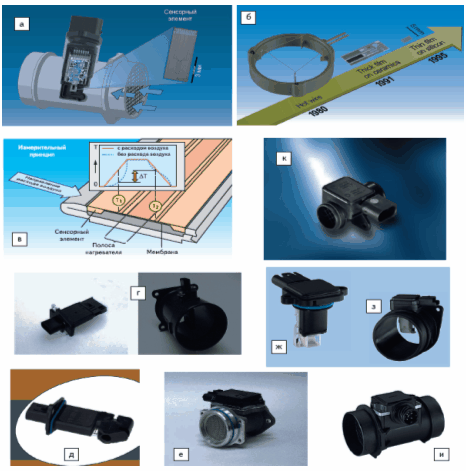 Рис. 3. Современные автомобильные датчики массового расхода воздуха: а — микромеханический датчик массового расхода воздуха Bosch; б — эволюция измерительных технологий Bosch; в — измерительный принцип микромеханического сенсорного элемента Bosch; г — датчики массового расхода воздуха Hitachi; д — датчики массового расхода воздуха Visteon; е — датчик массового расхода природного газа Hitachi; ж, з, и — датчики массового расхода воздуха SiemensVDO Integrated Mass Airflow (SIMAF) к — датчик расхода вторичных масс воздуха SiemensVDO.