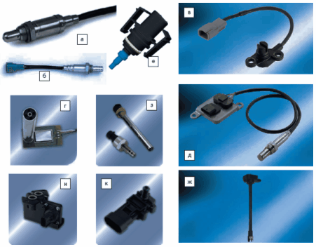 (иллюстрация с сайта www.sparkplugs.com); к, л —датчики газа NOx и соотношения воздух/топливо SiemensVDO и NGK Spark Plugs.