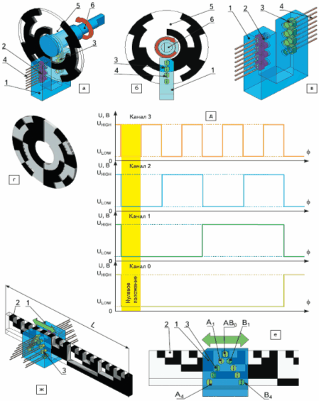 Принцип действия магнитостриктивного датчика линейного положения проиллюстрирован рис. 23г, д.