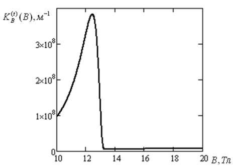 Рисунок 8 – Зависимость коэффициента примесного поглощения с учетом лоренцева уширения уровней энергии электрона от величины магнитной индукции (