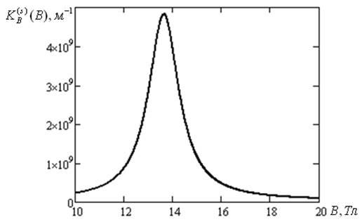 Рисунок 4 – Зависимость коэффициента примесного поглощения с учетом лоренцева уширения уровней энергии электрона от величины магнитной индукции (