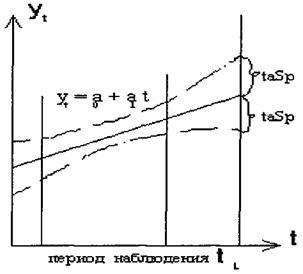 Погрешность, связанная со вторым и третьим источником, может быть отражена в виде доверительного интервала прогноза. Доверительный интервал, учитывающий неопределенность, связанную с положением тренда, и возможность отклонения от этого тренда, определяется в виде: