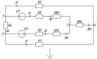Рассчитаем значения токов ветвей методом уравнений Кирхгофа. Для расчета используем схему, приведенную на рис. 1. Данная схема содержит 5 узлов, 8 ветвей, 2 источника ЭДС и не содержит источников тока. Подсчитаем количество уравнений системы, составленной по методу Кирхгофа.