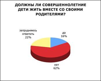 Большинство высказываний, прочитанных мною на форуме очень похожи. И проблемы почти не отличаются друг от друга. Но основной проблемой в отдельном проживании является реакция родителей на то, что их дети уходят. Здесь играет, возможно, родительский эгоизм (см. высказывание 8), либо это не совместимость в быту, особенно это касается молодых пар, которые живут с родителями (см. высказывание 1), либо желание детей начать взрослую самостоятельную жизнь, а родители еще не могут воспринимать своего ребенка в качестве взрослого сформировавшегося человека. Так же, мною были найдены материалы исследования, проведенного Исследовательским центром SuperJob.ru 5–6 июня 2008 года. В нём приняли участие 5000 респондентов из всех округов Российской Федерации. Исследуемая совокупность: экономически активное население России старше 18 лет. Респондентам был задан вопрос: "Должны ли, по Вашему мнению, совершеннолетние дети жить вместе со своими родителями?"