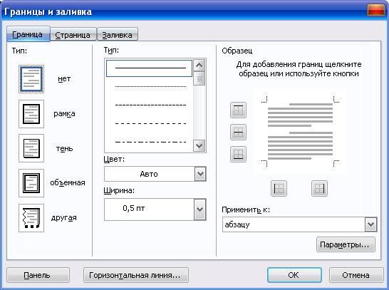 Для оформления заголовка, абзаца или целой страницы рамкой (в том числе с тенью), заливкой и т. д. необходимо вызвать диалоговое окно Границы и заливка