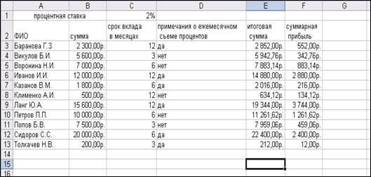 Дан список вкладчиков банка с указанием фамилий, суммы, срока вклада (3, 6 или 12 месяцев) и примечаний о ежемесячном съеме процентов («да», «нет»). Известна также единичная месячная процентная ставка по депозитным вкладам. Рассчитать итоговые суммы отдельных вкладов по истечении срока вклада с учетом двух возможных ситуаций: с ежемесячным съемом процентов или капитализацией процентов.