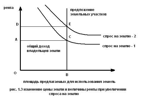 Поэтому повышение спроса на землю реально ведет не к увеличению предложения, а к росту ренты — цены за земельные участки, получаемой их собственниками (рис. 1.3)