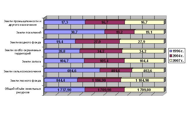 Из диаграммы 1 хорошо видно, что в ходе кадастровой оценки были существенно уточнены границы поселений, объём земель сельхозназначения, объёмы земель лесного фонда, объёмы земель водного фонда – то есть все основные категории земельных ресурсов РФ на сегодняшний день. Попутно отметим, что данная классификация, как в варианте 1996 года, так и в варианте 2004 г. абсолютно непрозрачна по отношению к земельным ресурсам РФ, используемым гражданами для личных, приусадебных нужд, и, отчасти, ИЖС, всё ещё являющихся источником основного объёма сделок с земельными ресурсами РФ на публичном рынке.