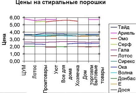 Дані про ціни на види пральних порошків в усіх магазинах представлені у вигляді діаграми1.
