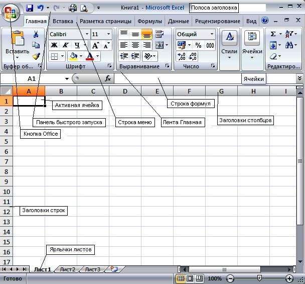 Верхняя строка окна приложения Excel называется полосой заголовка. В ней указывается имя программы Microsoft Excel и название рабочей книги Книга1 (либо открытого файла).